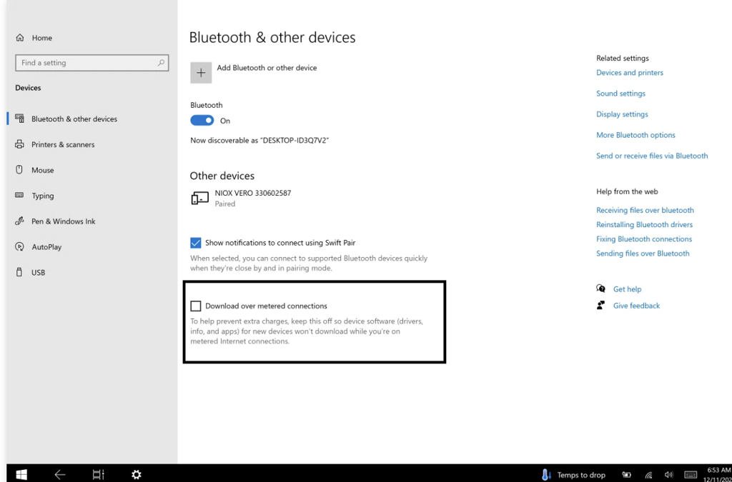 Metered connections: Sometimes a device in the Bluetooth settings will get the message, “Cannot connect using metered connections”. There is a setting below the Bluetooth pairing settings that can be toggled to resolve this issue.